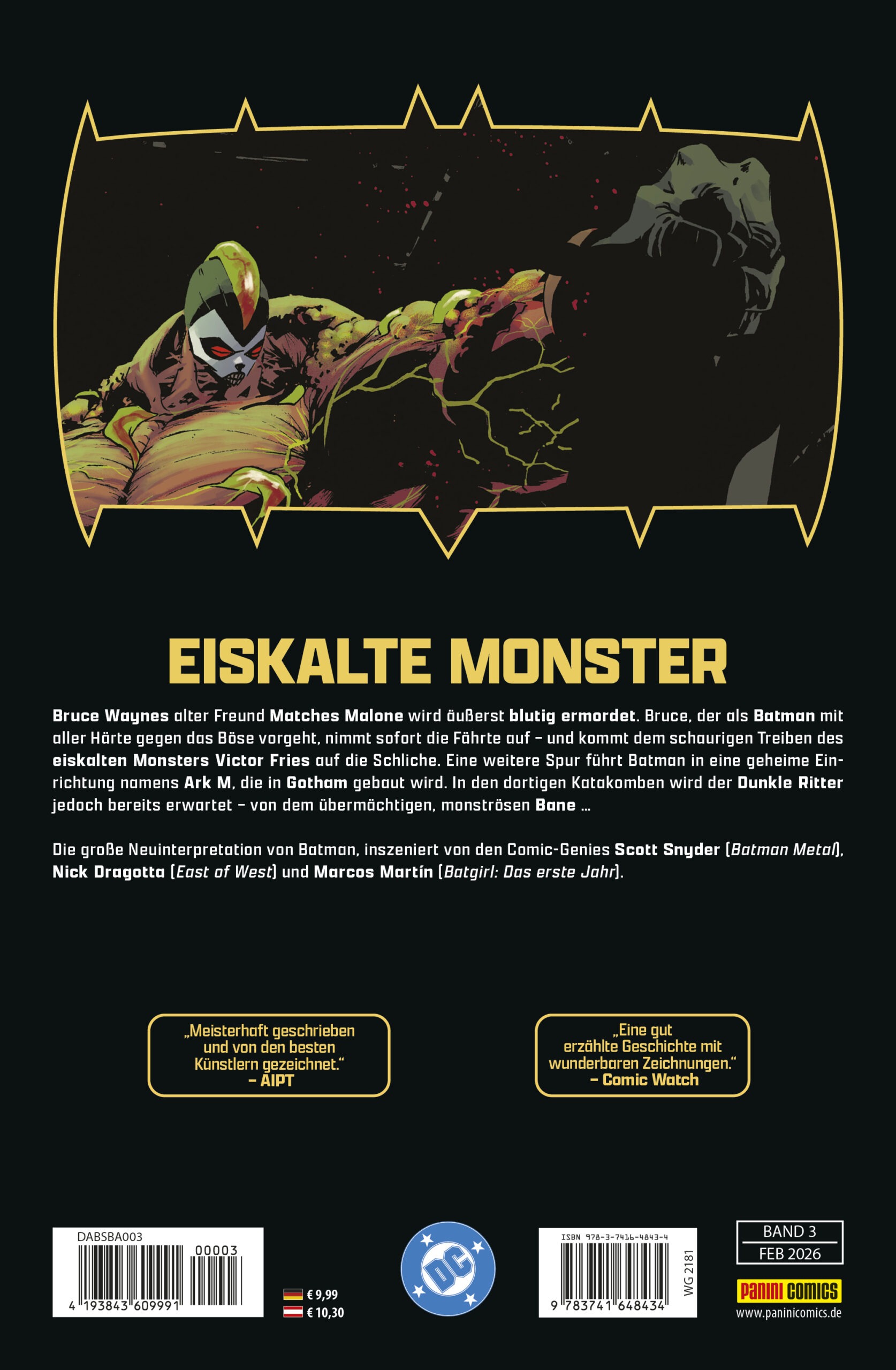 Einer der größten Comic-Bestseller der letzten Jahre, der Fans und Kritiker begeistert, geschrieben von Comic-Superstar Scott Snyder! Im neuen Absolute-Universum stammt Bruce Wayne aus der Arbeiterklasse und geht als brutaler Batman unermüdlich gegen das Böse vor. Nun untersucht er den so mysteriösen wie blutigen Tod seines alten Bekannten Matches Malone – und kommt dem eiskalten Monster Victor Fries auf die Schliche. Um einen anderen Freund zu retten, muss der Dunkle Ritter außerdem die Einrichtung Ark M betreten. In deren Finsternis erwartet ihn aber bereits der monströse Bane.